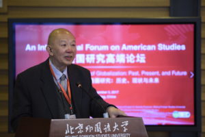论坛发言阶段,11位来自中美两国的美国研究领域的优秀学者,围绕“全球化背景下的美国研究”主题进行了主旨发言。专家学者就中美两国学者在美国研究领域的研究定位、研究内容、研究方法和研究成果进行了深入剖析和反思,论坛上的主旨发言和交流对话广泛涉及中美政治外交关系、美国社会文化与文学艺术、美国少数族裔、美国史学研究等多个主题。