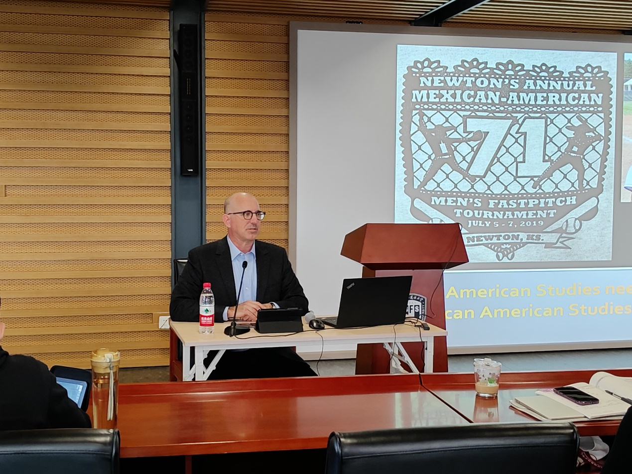 本·查佩尔教授首先从美国和墨西哥两国关系的历史讲起,阐述了美国墨西哥裔的民族特征和文化传统,及其对美国社会发展所作的贡献。他表示,19世纪40年代,美国发动美墨战争,吞并了原属于墨西哥的德克萨斯、新墨西哥、加利福尼亚等地,这些地方的墨西哥人随即成为墨西哥裔美国人。作为美国社会的少数族裔,他们在争取平等权利的过程中逐渐形成了自己鲜明的民族特征和文化传统。他们的“趴地跳跳车”和“快速垒球”运动不仅是鲜明的民族文化标志,也是美国社会一道亮丽的风景线。在讲座中,查佩尔教授还从美国民主党人和共和党人对待移民的态度等方面阐述了美国研究中种族、移民及身份认同的重要性,驳斥了“美国拉美化”的错误论调,强调了墨西哥裔美国人对美国社会发展的重要贡献。在讲座的问答环节,查佩尔同在场的师生进行了热烈的交流和讨论。