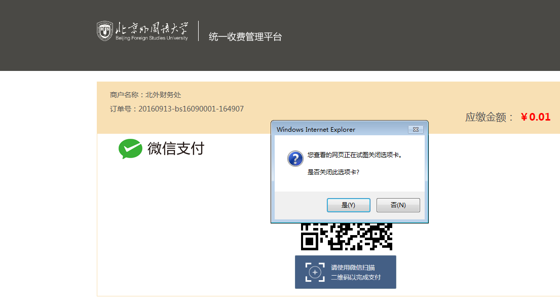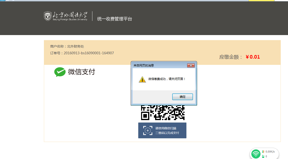 第三步:扫码完成之后,会弹出微信缴费成功,请关闭页面,点击确定。