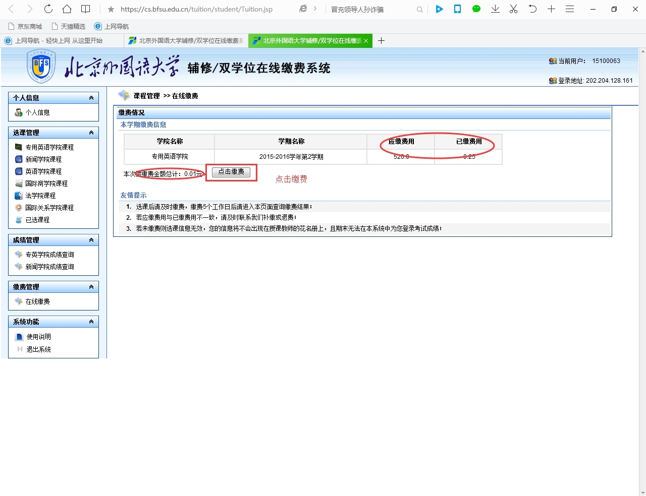 本学期网上选课交费系统今日开通,选课交费开始时间定于2016年9月14日上午11:00,结束时间定于2016年9月28日上午11:00。请选修菲律宾欧博游戏官网辅修二外5-8级和双学位(双专业)需要补交学费的在校生,按时登录“在线缴费系统”选课交费,及时交费。