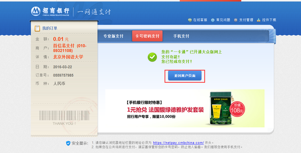 第三步;完成支付后,点击【返回商户信息】即可查看订单支付情况信息