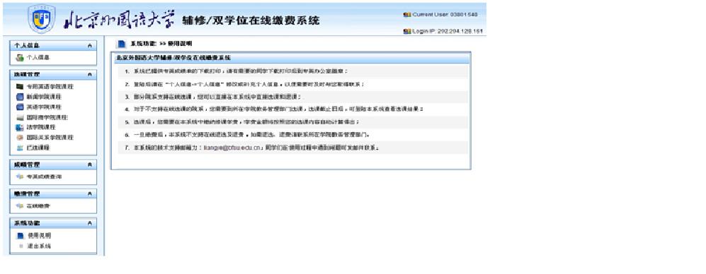 进入“在线缴费系统”后,请点击页面左侧相应课程名称,选择课程,或点击“已选课程”确认信息交费。